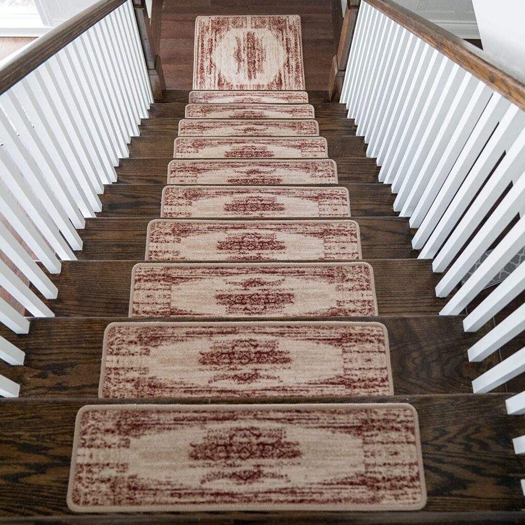Carpet treads, which attach to the stairs with highly adhesive carpet tape, are available in a variety of styles—from intricate baroque designs to plain, low-pile Berber—and are typically sold in sets of 15 treads and some sets also come with an additional landing carpet for the floor at the bottom the stairs.