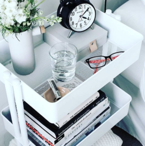 Any sleep expert will tell you that keeping everything you need for a good night’s sleep close to your bed is critical. You don’t have to get out of bed to find reading glasses, books, an alarm clock, or a drink of water because they’re all right there. A well-organized tiered rolling cart provides just the right amount of storage space for all of your bedtime essentials and takes up a lot less space than traditional bedside cabinet.