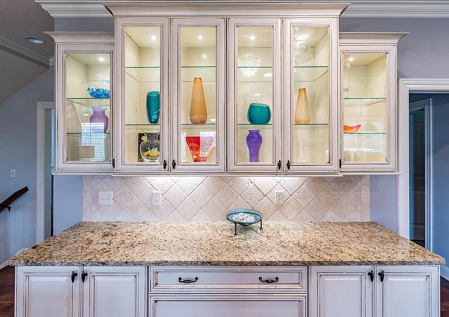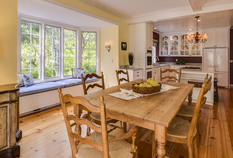 To accomplish a bright, clean look, layer different light types together. For general lighting, which is the main light in addition to windows, install recessed lights, flush mounts, or larger light fixtures. Then with accent and task lighting, include island lights and lights over the dining table to highlight these elements. Place lights under wall cabinets to chase away shadows and create a brighter counter space. By layering lights together, you create a more inviting atmosphere.
