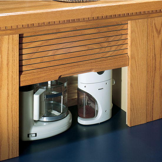 The tambour door style is a popular choice for an appliance garage. This type of appliance garage has a door that rolls up and down and makes it easy to get to the appliances stored inside. With this design, the door can roll up smoothly and be tucked away neatly when it’s open. design allows the door to roll up smoothly and tuck away neatly when opened. Tambour doors can be customized to match your kitchen cabinetry, seamlessly blending with your existing decor.