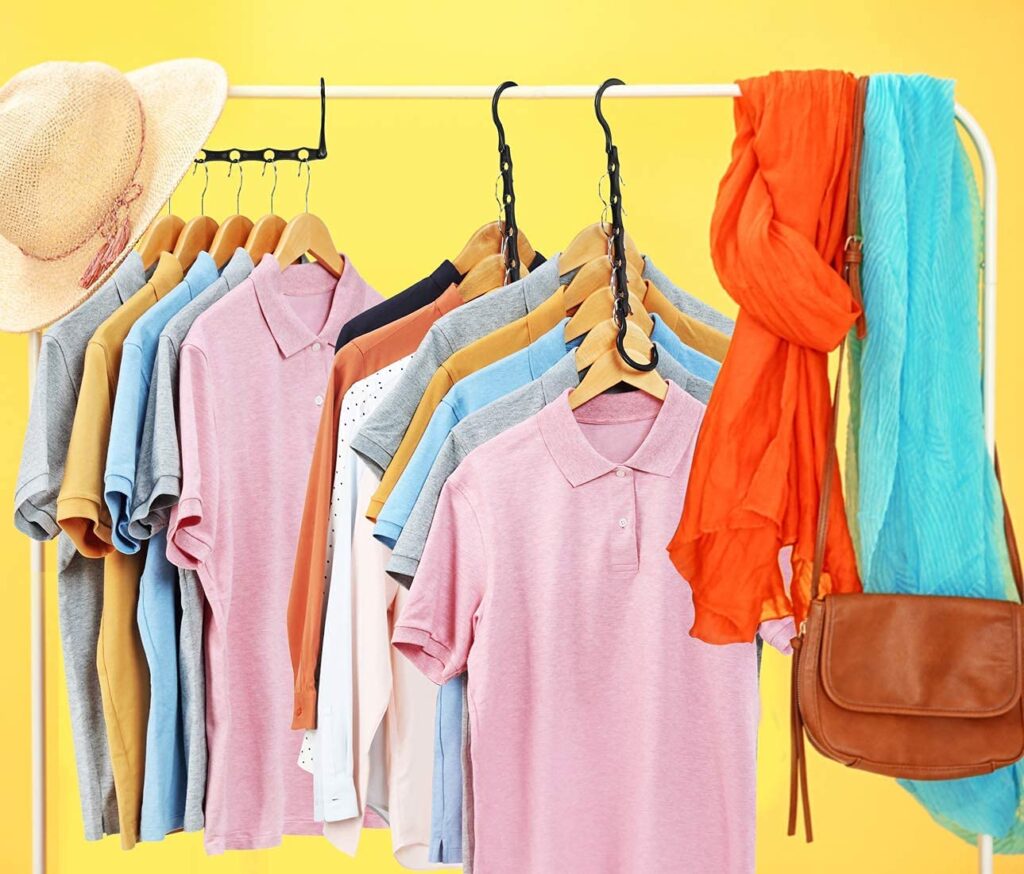 The second option to hang more stuff in that little closet is to buy space-saving hangers. There are a number of different options, but those that ‘drop down’ and can accommodate several pairs of jeans/skirts/pants at once are particularly useful.
