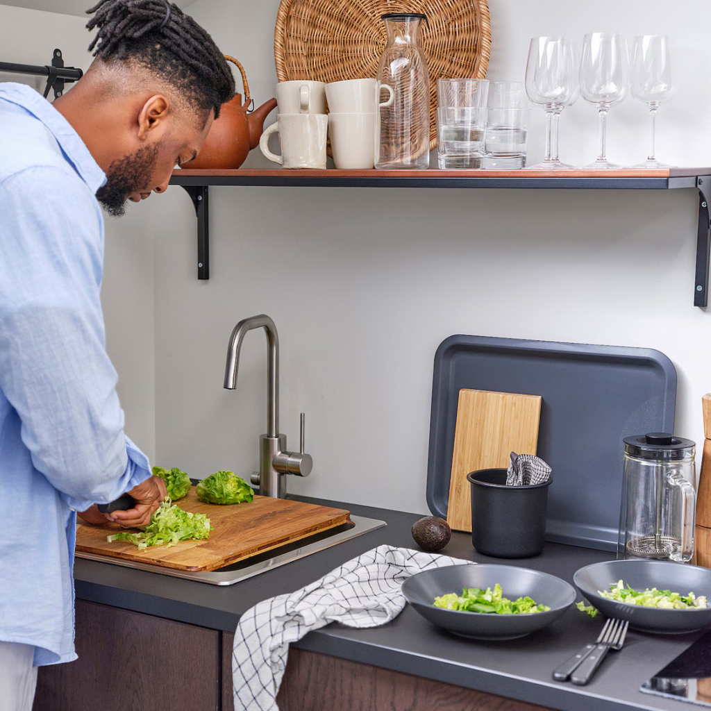 Start by removing everything from your counters that won’t be part of meal preparation: