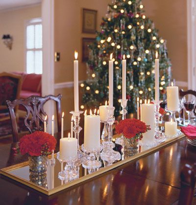 Alternatively use a mirror tile in the center of the table and top with a selection of glass candlesticks in different shapes and sizes. Surround with a few baubles that coordinate with your color scheme and some festive foliage. The mirror is a great way of accentuating the soft glow of the candlelight for a magical touch.