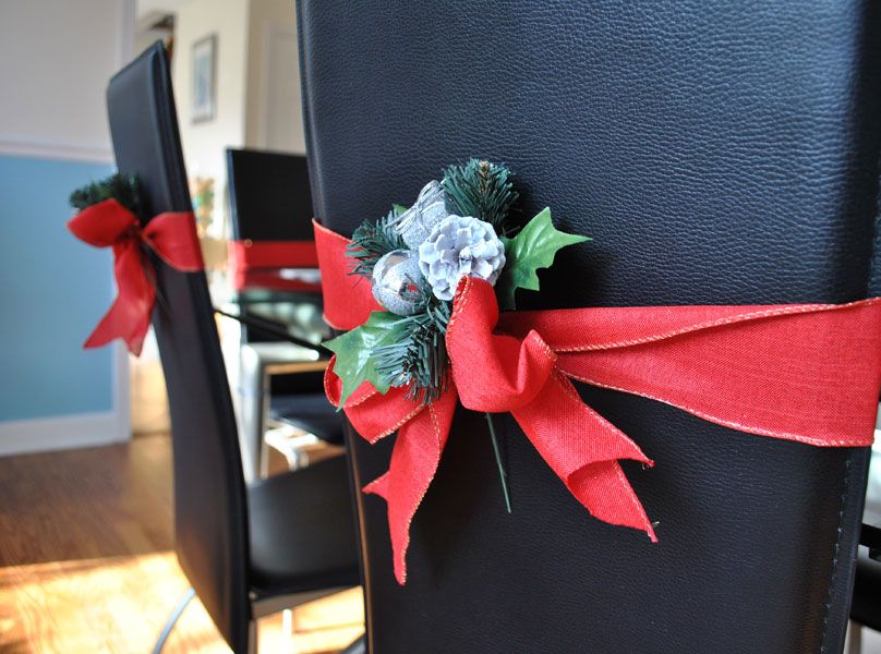 Plain baubles can be personalized with a metallic marker pen, then simply hung from the chair. For more drama, go for a bauble cluster – thread four or five different sized baubles together and add in some foliage for a finishing touch.