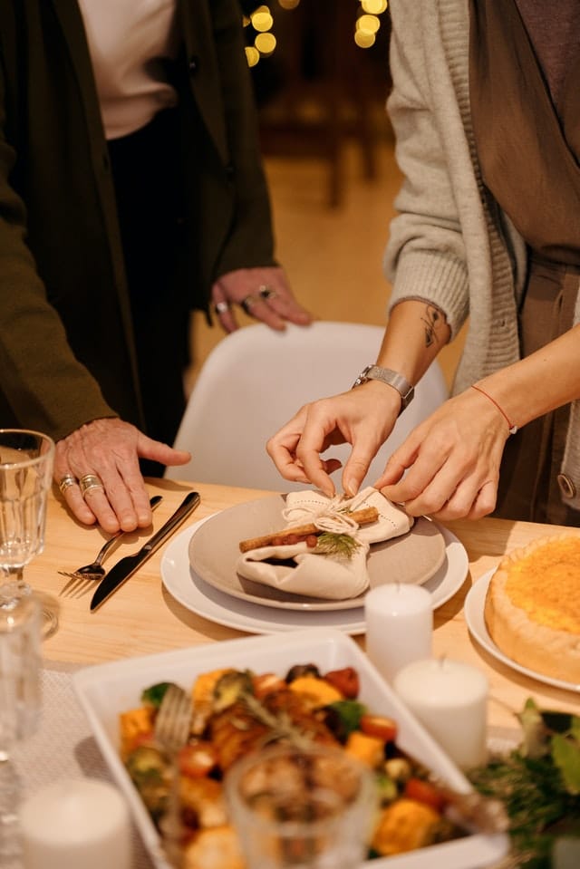 Napkins can be as simple or elaborate as you want to make them. A simple option could be rolled in a napkin ring or tied with a length of pretty ribbon, or if you really want to impress your guests transform your napkins into fancy pockets for your cutlery or even an elf hat – here’s a great YouTube tutorial to help you: