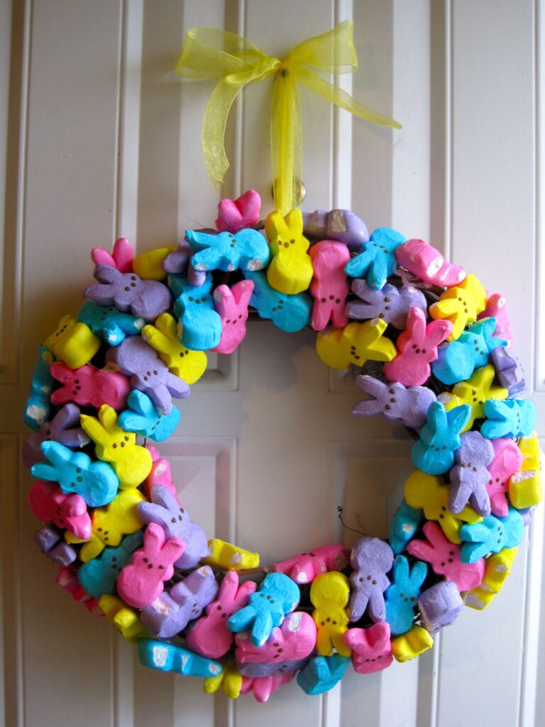 Create a colorful and fun Easter wreath using Peeps. Simply arrange Peeps in a circular shape and use toothpicks to secure them together. Add some colorful ribbons or Easter decorations to finish off the look.
