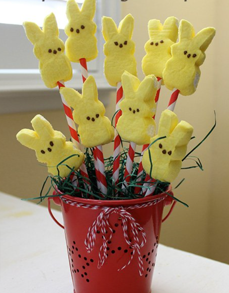 Create some festive Easter planters by using Peeps as a base. Simply fill a pot with soil, arrange Peeps around the edge of the pot, and then plant some colorful flowers in the center. No soil? That’s fine, the Peeps don’t need it, so you can use inexpensive Easter “grass’ instead! This is a fun and easy way to add some color to your Easter decor.