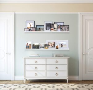 Create a gallery wall using floating shelves to display a collection of photos, artwork, or memorabilia. Play with different lengths and arrangements, ensuring each piece has its own spotlight while contributing to a cohesive display.