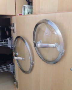 Attach adhesive hooks to the inside of cabinet doors to hang pot lids. This keeps them out of the way and ensures they’re easy to find when you need them.