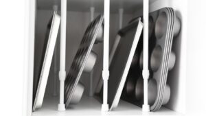 Install tension rods—the kind you can get at a dollar store are fine—vertically inside a cabinet to create custom slots for baking sheets, cutting boards, and serving trays. This hack allows for easy access and better utilization of deep cabinet spaces.