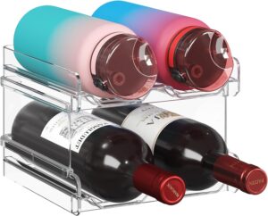 Use stackable wine racks inside cabinets to neatly store water bottles, condiments such as oils, vinegars, and other drinks. This not only keeps bottles secure but also maximizes vertical space.