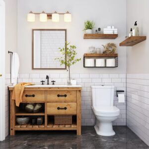 Adding floating shelves above the toilet can be a smart use of otherwise wasted space. Choose shelves that match your bathroom’s decor to add a stylish touch. Wall-mounted baskets are great for holding items used daily, ensuring they’re within easy reach but off the counter.