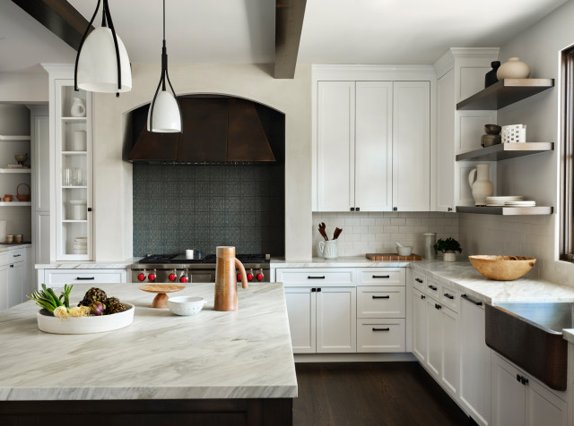 For lovely glimpses of modernity and personality in your modern farmhouse, look to inky blues, emerald greens, and charcoal grays in addition to black. In terms of accessories like tiled splashbacks, handle colors, or even internal cabinet components, we enjoy experimenting with deeper natural greens, blues, pinks, or terracottas on walls as well as in other areas of the home. Shades of green or deeper blue are frequently used in country settings because they feel natural and provide a sense of stability to the overall design scheme.
